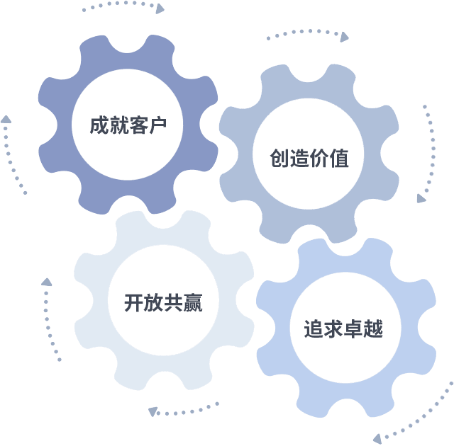 成就客户是一切决策的出发点,,,,创造价值是衡量所有工作的标准,,,,追求卓越是我们做事做人的态度,,,,开放共赢是我们的格局也是最终的结果。。价值观的齿轮环环相扣,,,推动着组织里的每个人不断向前。。